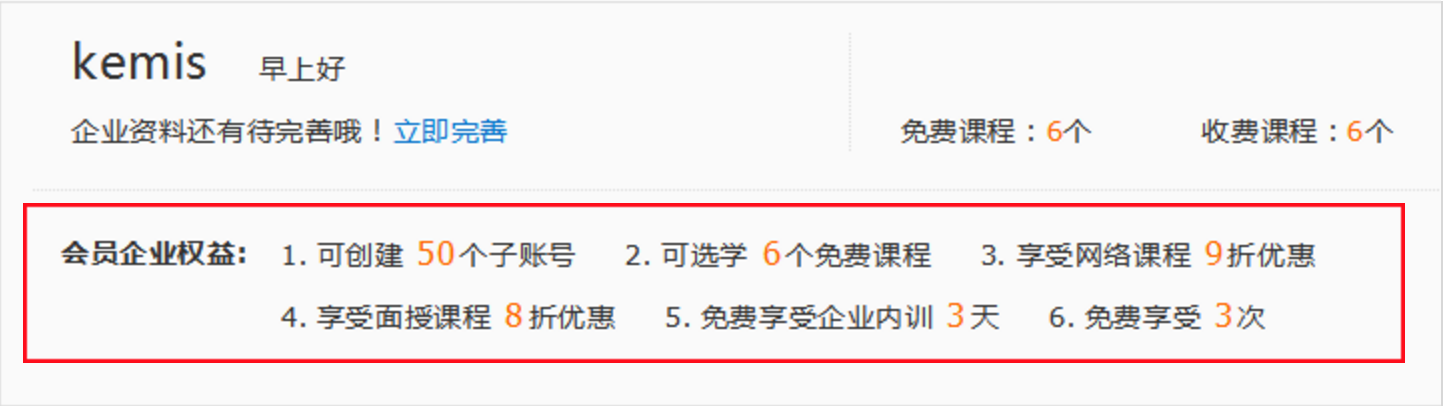登录个人中心即可查看企业会员享有的权益,包括享受免费课程数、网络购课折扣、面授购课折扣、免费内训天数、免费电话咨询次数等。